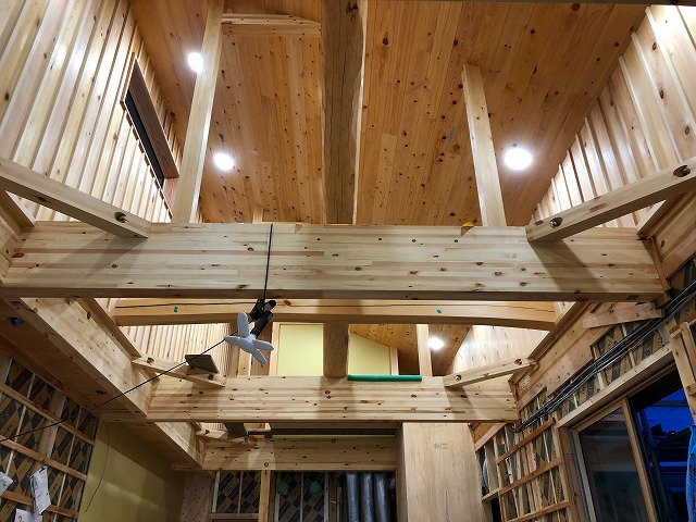 吹き抜けのところにカヤのタイコ梁とヒノキのタイコ梁があり